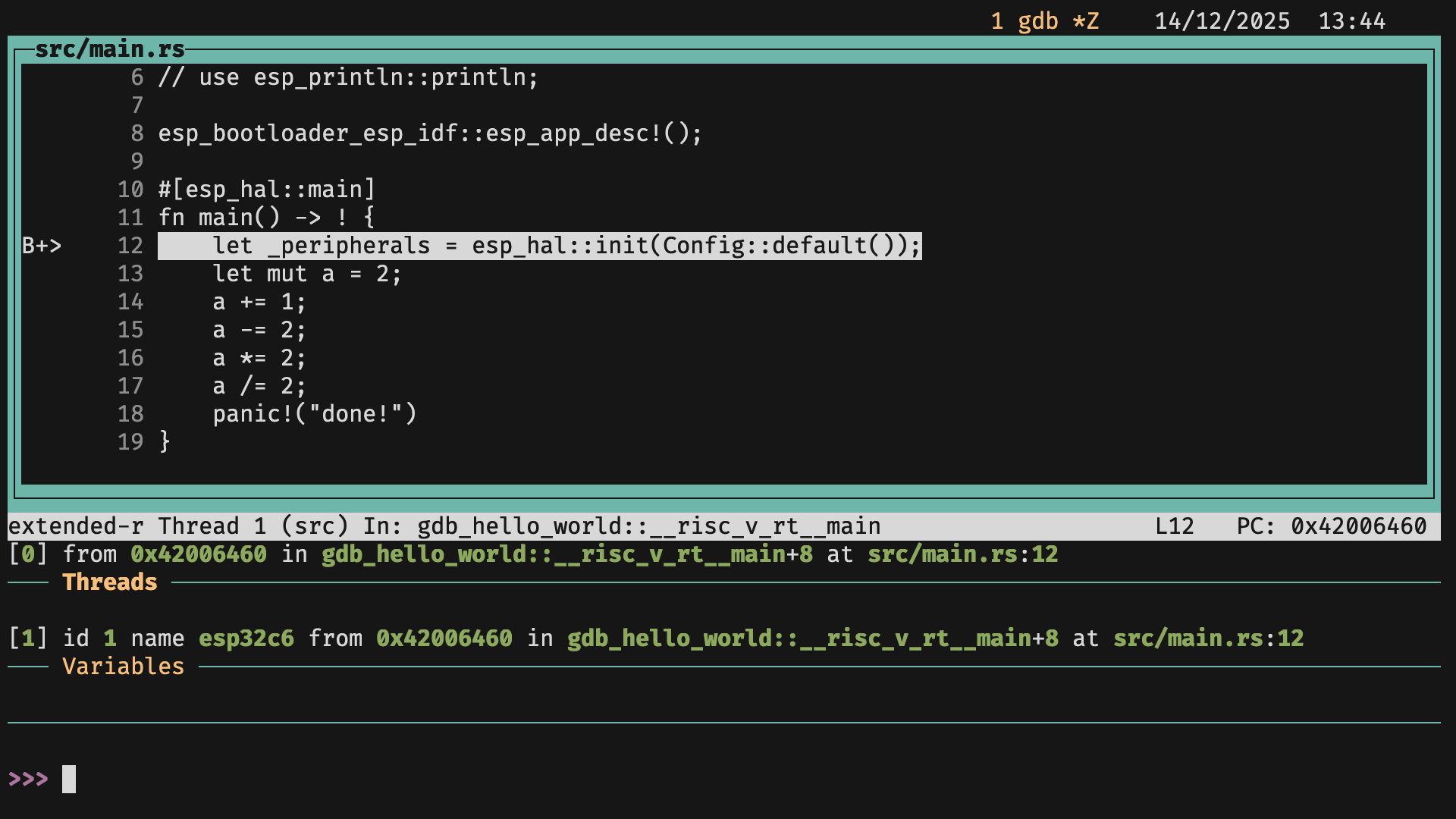 cargo run. You should see:.. 0x4080082e - handle_interrupts at ??:?? .. Commands: CTRL+R Reset chip CTRL+C Exit .. loop..! ..We will talk about the
